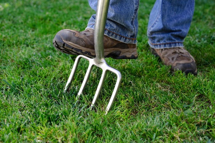 Compacted ground prevents grass growing well and can lead to bare patches in the summer and mud baths in the winter. Relieve the compaction and aerate the soil by pushing a garden fork about 10cm deep into the soil every 10cm and gently rocking back and forth on the fork handle. The prongs open up the soil, allowing the roots to breathe and encouraging the grass to regrow.